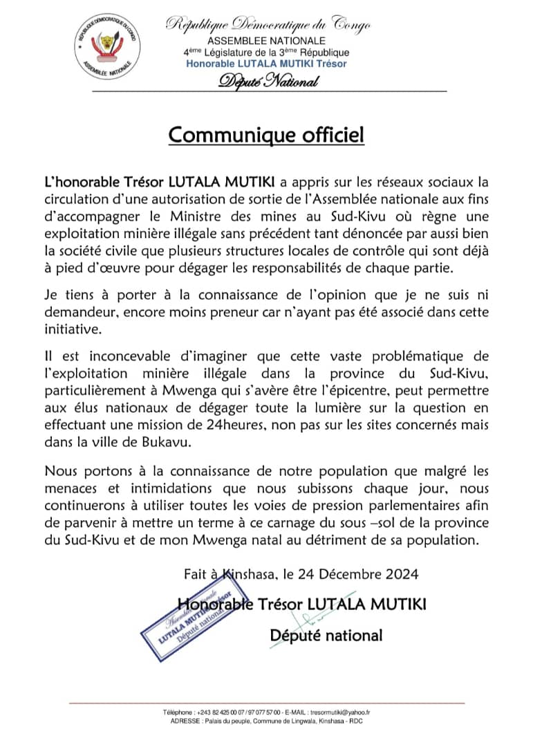 Dans un Communiqué Officiel dont une copie est parvenue à la Rédaction Afrique Monde, signé ce 24/12/2024, l’honorable Trésor MUTIKI, un homme intelligent, averti a su déjouer certains pièges tendus et dit non à ce genre de pratique, dans il porte la connaissance de l’opinion qu’il n’a jamais été ni demandeur, encore moins preneur car n’ayant pas été associé dans cette initiative. Selon lui, il est inconcevable d’imaginer que cette vaste problématique de l’exploitation minière illégale dans la province du SUD-KIVU, particulièrement à MWENGA qui s’avère être l’épicentre, peut permettre aux élus nationaux de dégager toute la lumière sur la question en effectuant une mission de 24 heures, non pas sur les sites concernés mais dans la Ville de BUKAVU.