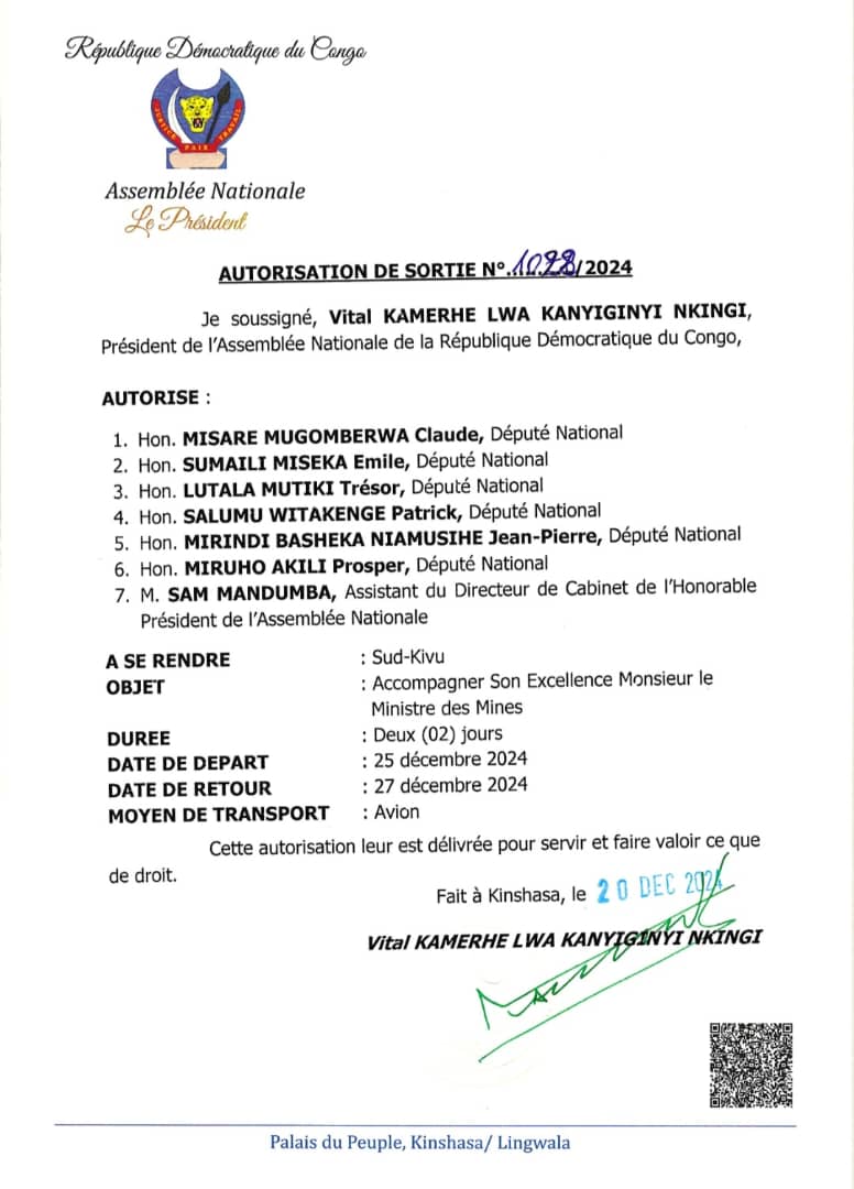 Tout le monde l’a lu dans les réseaux sociaux ou par voie d’affiche, le Président de l’Assemblée Nationale honorable Vital KAMERHE autorise une équipe de 7 députés nationaux à se rendre au SUD-KIVU, ayant comme d’accompagner Son Excellence Monsieur le Ministre des Mines dans une Autorisation de Sortie signée le 20/12/2024. Curieusement, il n’a pas consulté certains parlementaires quant à ce.