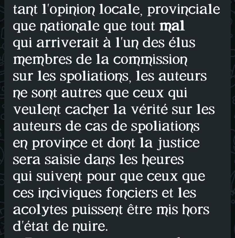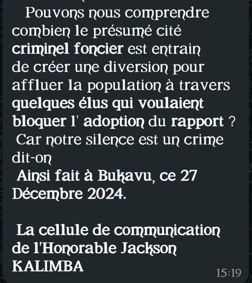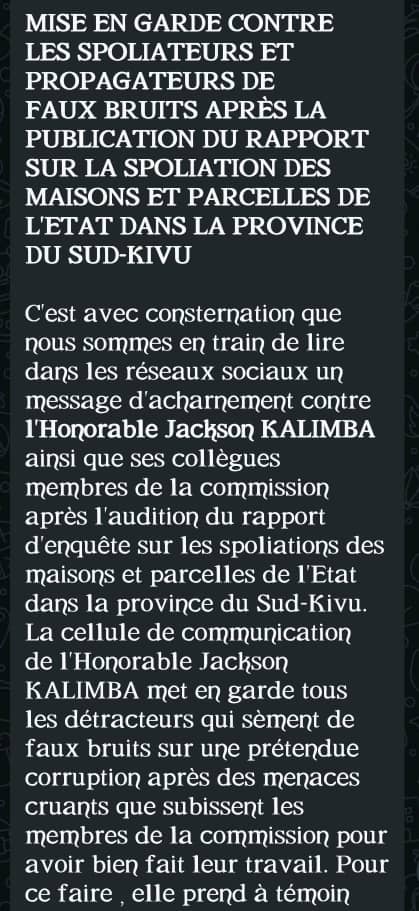 Après cette présentation le Député Provincial Jackson KALIMBA dit SAUTI YA WANYONGE, un des membres de cette commission est victime d’une campagne de diabolisation, œuvre de certaines personnes citées dans ce rapport comme spoliateurs ou complices de la spoliation.