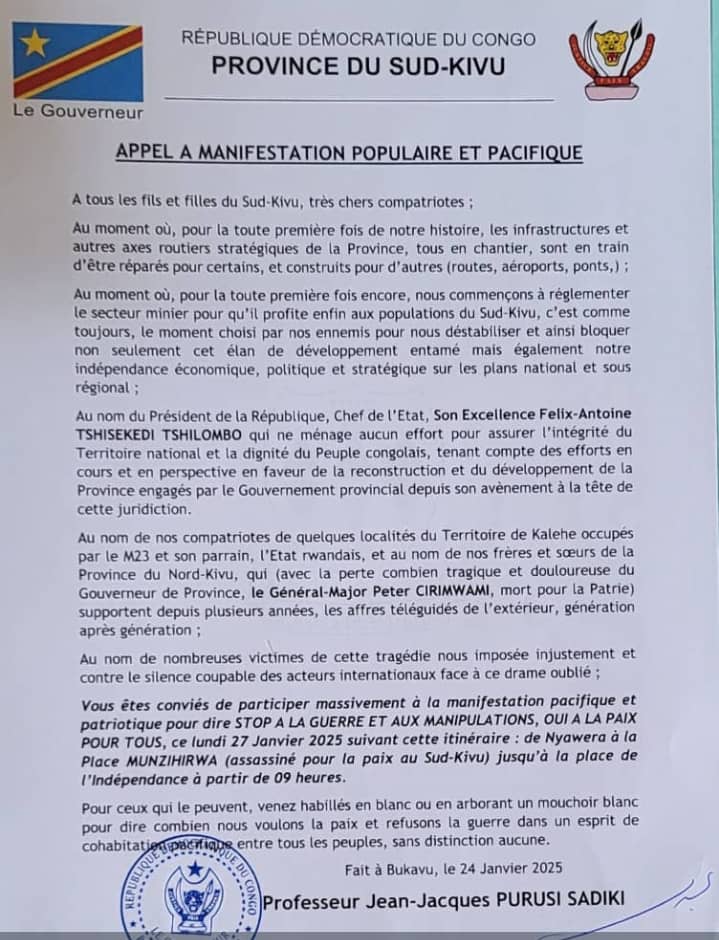 La population du SUD-KIVU est conviée de participer massivement à la manifestation pacifique et patriotique pour dire STOP A LA GUERRE ET AUX MANIPULATIONS, OUI A LA PAIX POUR TOUS, ce lundi 27 janvier 2025 suivant cette itinéraire : de NYAWERA à la Place MUNZIHIRWA (assassiné pour la Paix au SUD-KIVU) jusqu’à la Place de l’Indépendance à partir de 09 heures.