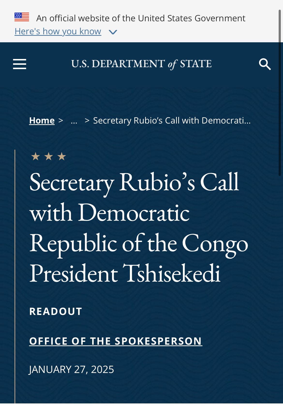 Ce lundi 27 janvier 2025, le Secrétaire d’État Marco RUBIO a appelé aujourd’hui le Président de la République Démocratique du Congo (RDC), Félix-Antoine TSHISEKEDI TSHILOMBO, pour discuter des relations bilatérales et de leur renforcement.