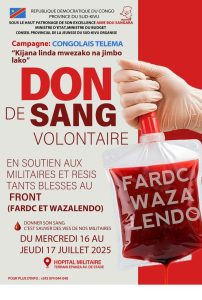 Ce mercredi 16 Juillet 2025, le Premier Suppléant du Double Brassard, Honorable Aimé BOJI SANGARA a prêché par l’exemple en s’alignant parmi les patriotes qui ont accepté de donner de leur sang pour sauver les vies des militaires et combattants wazalendo blessés au front pour la défense de notre patrie.